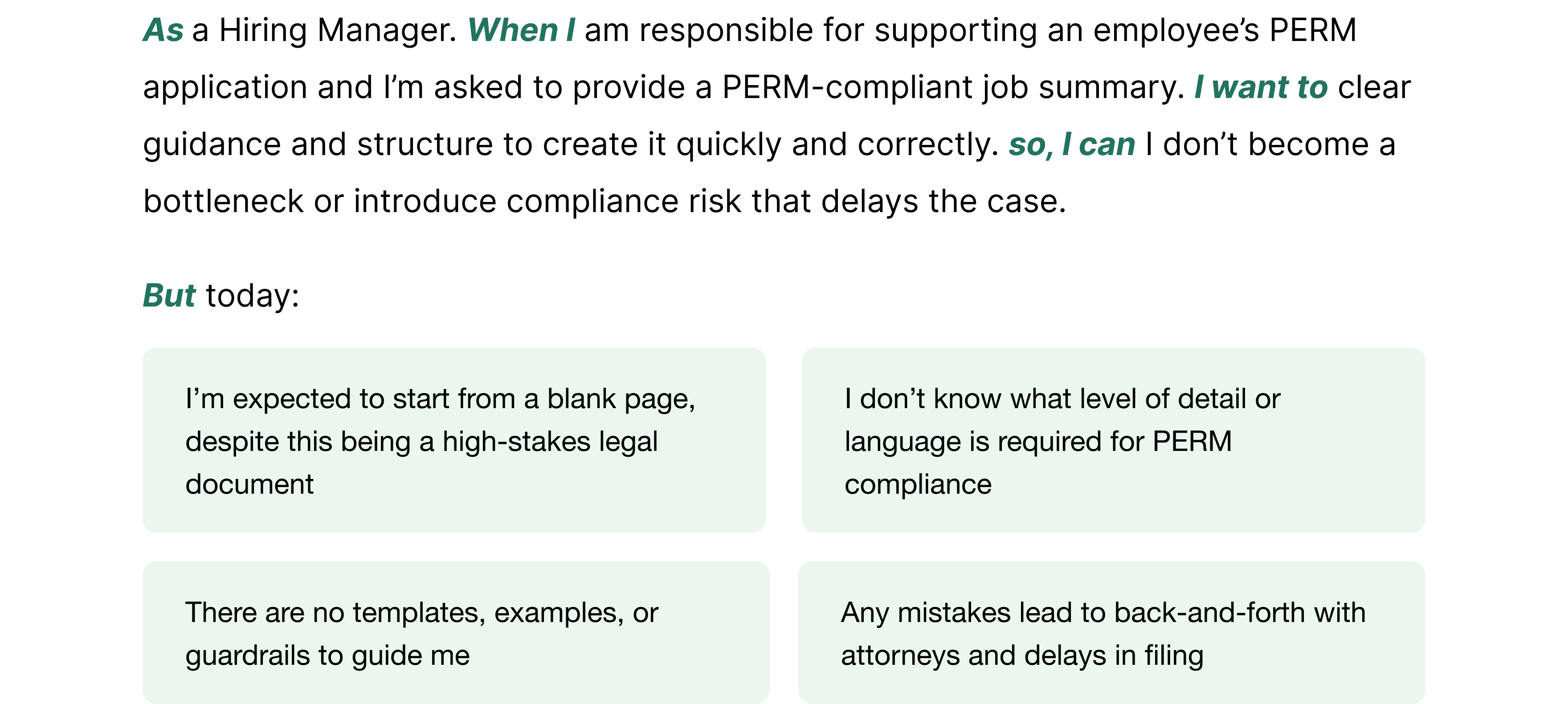 With minimal inputs, AI selects reliable data, applies a compliance layer, and generates a PERM-ready job summary in one click.