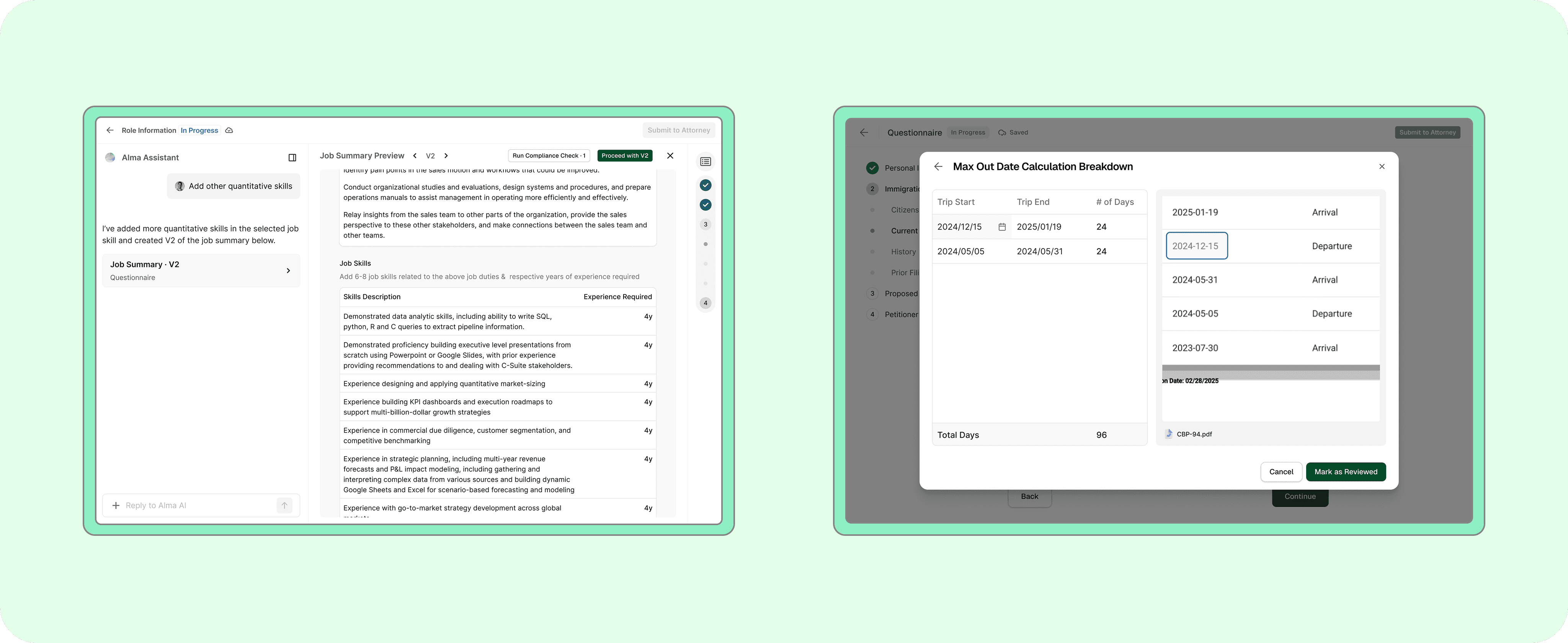 At Alma, case filing speed depends on how quickly multiple stakeholders - hiring managers, mobility teams, and attorneys can complete their parts of the process, yet key workflows were slowed by heavy manual effort. Through a workflow audit, I identified two major bottlenecks: hiring managers struggled to write PERM-compliant job summaries, leading to repeated back-and-forth, while attorneys manually reviewed I-94 travel histories in spreadsheets to calculate visa max-out dates. I led the design of AI-powered experiences to eliminate this friction, rapidly prototyping and validating solutions using tools like Lovable to integrate AI directly into existing workflows. As a result, job summary turnaround time was reduced from ~10 days to under 24 hours, and max-out date calculations dropped from ~1.5 hours to 14 minutes, directly accelerating case readiness and filing velocity across teams.