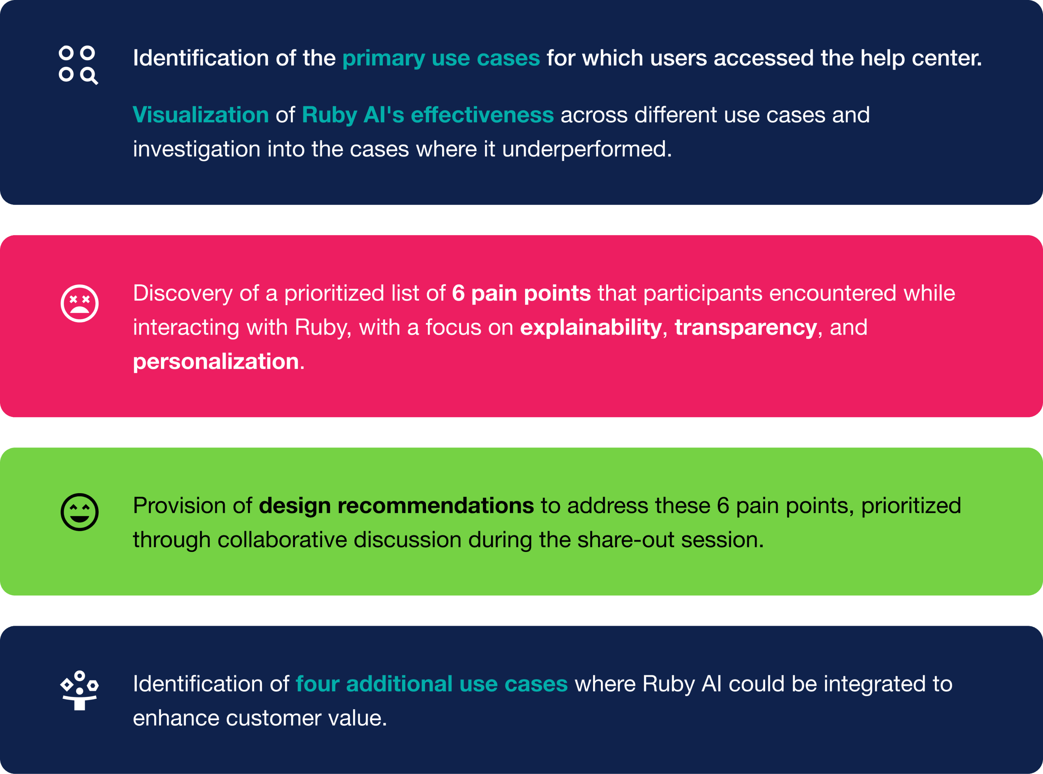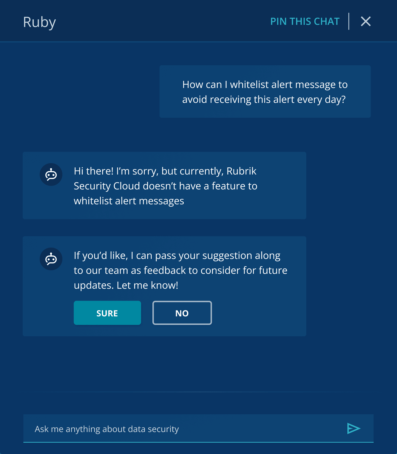 Discover and prioritize additional use cases where AI integration in the product can add value for users. These insights will guide future development and enhance Ruby’s overall utility for Rubrik users.