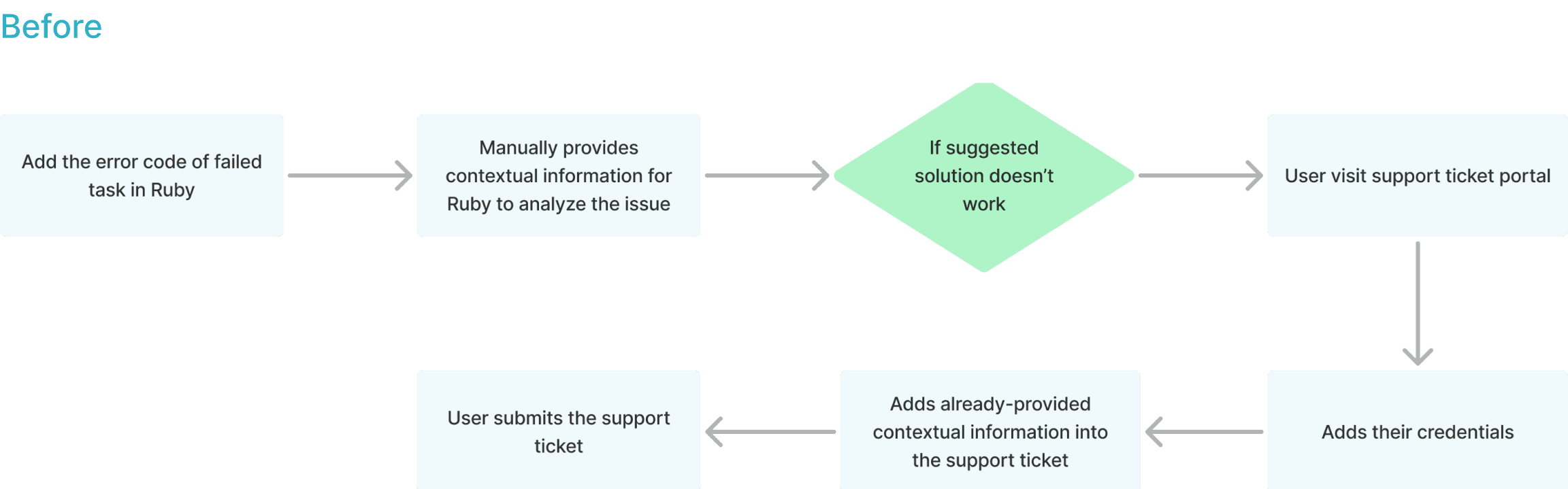 Users faced frustration and inefficiency when creating a support case, as they had to manually re-enter contextual information already shared during troubleshooting with Ruby. This redundancy not only prolonged the process but also contributed to a poor overall user experience.
