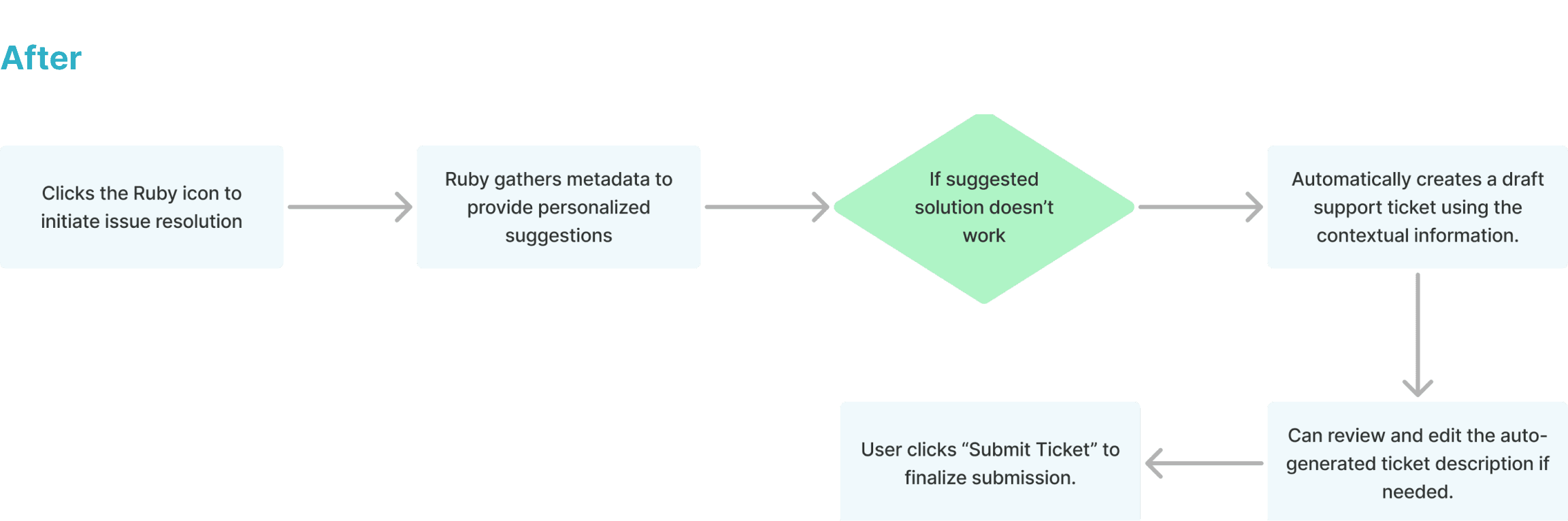 Leveraging research insights from the 'support ticket creation' use case, I iteratively refined and crafted the final design. Below is a comparison of the user flow before and after implementing the proposed solution.