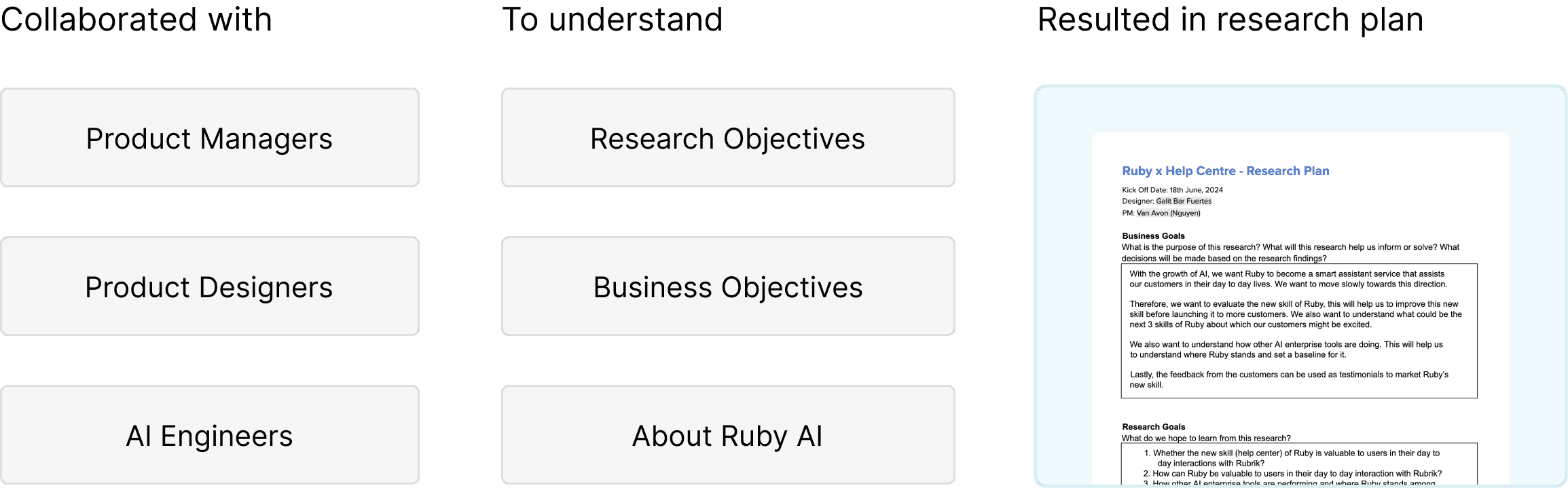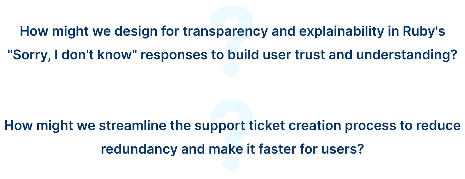 I led a UX evaluation of Ruby GenAI's beta feature for generating Help Center summaries to prepare it for broader release. Using a 5-day diary study with 6 participants and 17 interaction responses, followed by in-depth interviews, I uncovered 6 key pain points related to transparency, explainability, and personalization. To address these, I designed conversational improvements that enhanced the chatbot, boosting the KPI by 30.8%. Additionally, I identified 4 new use cases for Ruby AI integration, influencing the product strategy for the next two quarters. I designed an AI experience to automate and streamline support ticket creation, significantly improving the user experience.