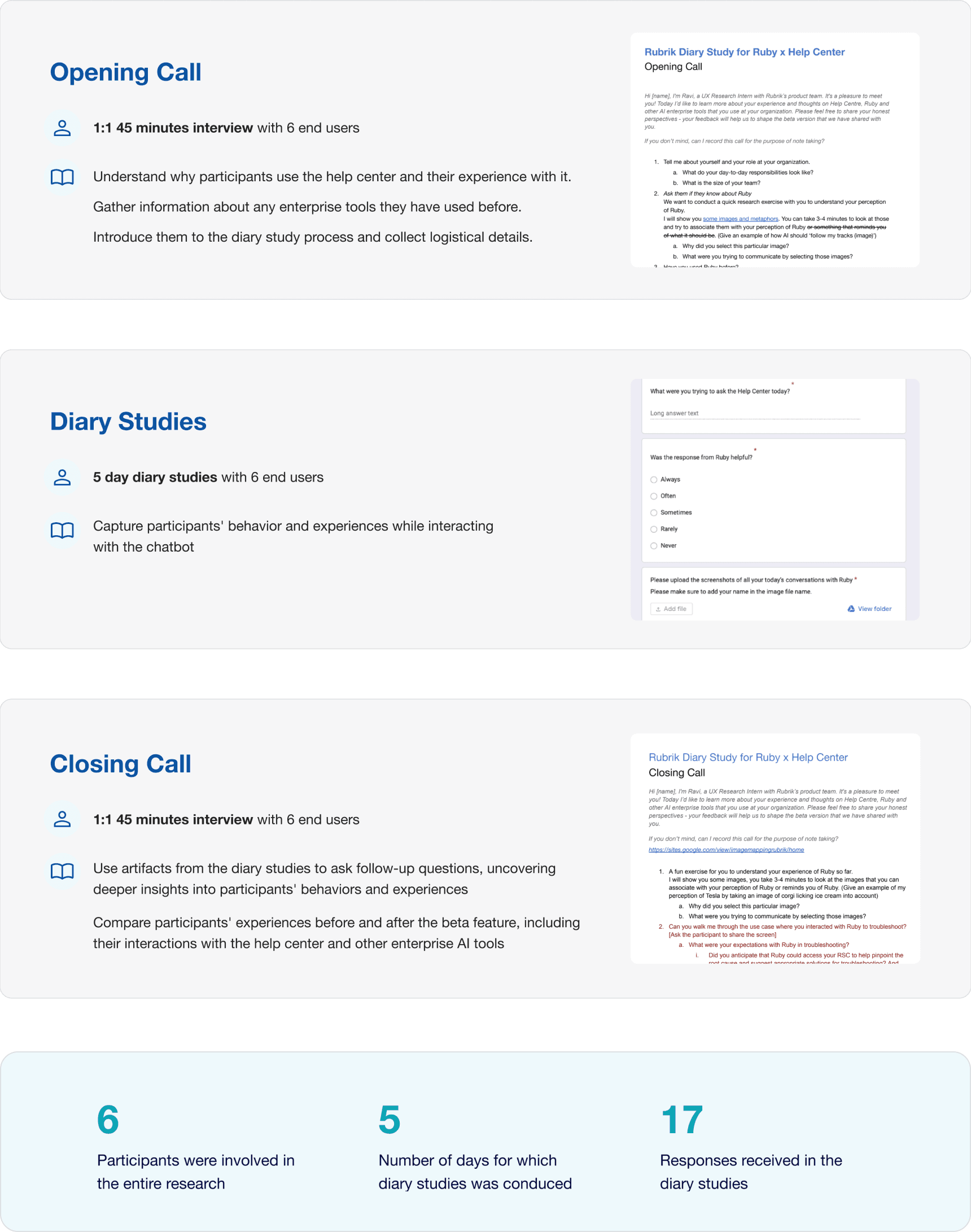 The evaluative research was structured into three key phases: Opening Interviews, Diary Studies, and Closing Interviews